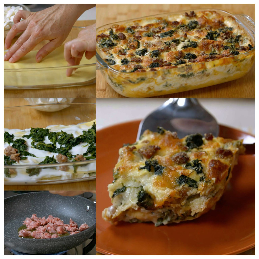 Ingredienti Dosi per 4 persone 500 g erbette di campo lessate 400 g salsicce 250 g sfoglie sottili pronte per lasagne 250 g mozzarella 60 g formaggio grattugiato olio extravergine di oliva q.b. 500 ml latte 30 g burro 30 g farina 00 noce moscata q.b. sale fino q.b. La Preparazione